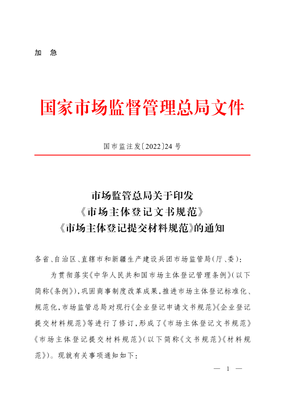 市場監管總局關于印發《市場主體登記文書規范》《市場主體登記提交材料規范》的通知